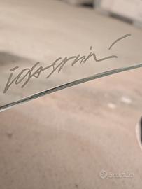 Tavolino FIAM "Genio" Design Massimo Iosa Ghini Vetro Curvato Originale In vendita un pezzo iconico del design italiano: il tavolino da caffè modello "Genio", disegnato dal celebre architetto Massimo Iosa Ghini per Fiam Italia (prodotto originariamente negli anni '80/'90). Questo tavolo è una vera e propria scultura domestica, caratterizzata da un'unica lastra di vetro di alto spessore, sapientemente curvata a caldo secondo la tradizione d'eccellenza di Fiam. Il design dalle linee fluide e organiche è completato da eleganti piedini in metallo che conferiscono stabilità e un tocco modernista. Caratteristiche Principali: Designer: Massimo Iosa Ghini (membro del prestigioso Gruppo Memphis). Produttore: Fiam Italia. Materiale: Cristallo curvato ad alta resistenza. Dettaglio di Autenticità: Firma del designer incisa direttamente sul vetro (visibile in foto) Dimensioni Altezza: 37 cm (14,57 in) Larghezza: 120 cm (47,25 in) Profondità: 87 cm (34,26 in)
