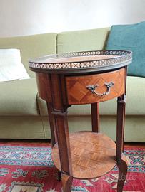 Tavolino francese del XX secolo. Mobile finemente intarsiato con decori floreali e geometrici in legni di bois de rose, noce, acero, mogano e legni da frutto. Tavolino finito da centro di ottima proporzione facilmente inseribile in diversi punti della casa. Mobile munito di due piani di appoggio di cui quello superiore con ghiera in ottone (vedi foto). Tavolino completo di un piccolo cassetto frontale di buon servizio. In buone condizioni ma necessita di un restauro sul piano superiore