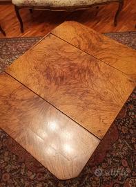 Tavolino francese stile Luigi Filippo in noce. Due alette apribili, due cassettini frontali ed un cassetto posteriore. Dimensioni:
