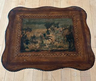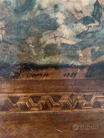 Intarsio: il dipinto è incorniciato da una raffinata fascia a intarsio geometrico (motivo a "greca") realizzata con legni di diverse essenze (probabilmente noce e acero o bosso per il contrasto chiaro).