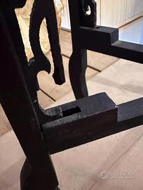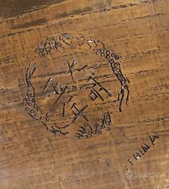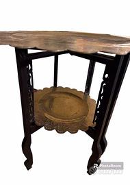 Tavolino vintage giapponese anni 40. Composto da una base in legno richiudibile sulla quale si inseriscono due piatti in ottone lavorati. La base presenta solo due punti in cui il legno si è rovinato ma non ne pregiudica l’utilizzo. Altezza del tavolino 50 cm circa. Diametro del piatto/vassoio superiore 60cm mentre il piatto inferiore 36cm.