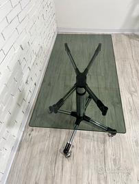 Tavolino girevole anni '70 con struttura in acciaio cromato, piano in vetro fumé, ruote integrate.