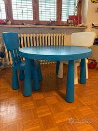 Tavolino rotondo blu con due sedie una bianca e una blu. In buonissime condizioni, solo qualche segno di scritta sulla superficie. No spedizione solo consegna di persona zona Cuneo o Torino previo accordo.