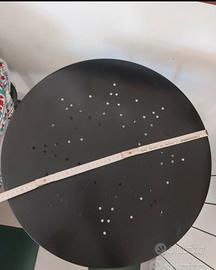 senza difetti medio peso, resistente, non fa ruggine, per interno, con dettaglio forato. diametro 48 cm, altezza circa 70. si può smontare ed è facile da rimontare con 3 viti incluse.
