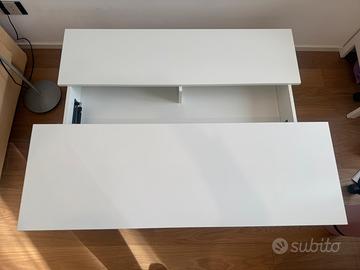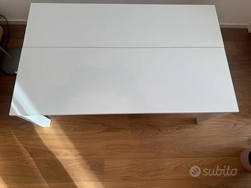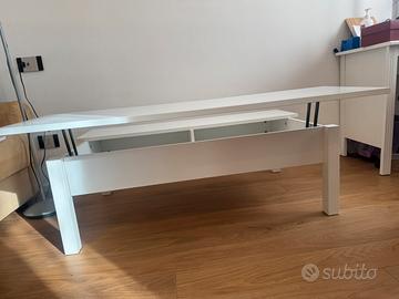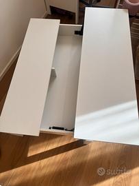 Vendo tavolino IKEA bianco con piano alzabile, perfetto per mangiare comodamente sul divano o lavorare al pc. Il piano si solleva in modo facile e stabile, creando una pratica superficie più alta e rivelando un ampio vano contenitore interno, ideale per riporre telecomandi, plaid, riviste o giochi da tavolo. Design moderno e lineare, si adatta a qualsiasi soggiorno. Usato ma in buone condizioni, con normali segni d’uso. Misure: larghezza 70 cm, lunghezza 115 cm, altezza 40 cm; da alzato arriva a circa 55 cm. Ritiro a carico dell’acquirente, zona Bologna Savena (piano e modalità di ritiro da concordare in chat).