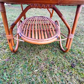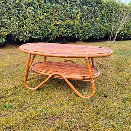 Tavolino in bambù di Tito Agnoli per Bonacina, anni '60. Progettato da Tito Agnoli per Bonacina è stato prodotto in Italia negli anni '60 ed è un esempio di come il design si possa sposare con tutti i materiali. L’azienda Bonacina è specializzata nella lavorazione del giunco e vanta collaborazioni con i grandi nomi del design quali Giò Ponti, Franco Albini, Tito Agnoli e molti altri. Il tavolino è ideale sia per un arredo esterno che interno e si trova in un ottimo stato conservativo. Bambú e Rattan colore naturale. Non presenta rotture, ma ovviamente segni del tempo visibili da foto. Stato originale, non trattato. Misure : lunghezza 97 cm, larghezza 57 cm, altezza 43 cm. Possibile ritiro a mano previo accordi.