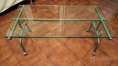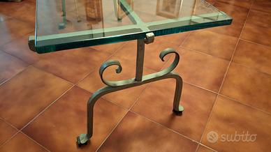 Tavolino in cristallo spessore 20 mm supporto in ferro battuto a mano realizzato nel 1976. Misure 110 cm x 55 cm, H 46 cm