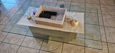 Vendo per cambio arredamento, il cristallo è spesso 12 millimetri lungo 120 cm X 70 cm appoggia su tre montanti in legno dove è situata un altra base in cristallo a mezza luna come da foto Potete contattarmi per mail e per cellulare