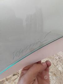 Tavolino in cristallo curvato con piedini in noce, Fiam Italia. L.98xP.60xH.37