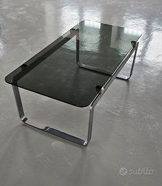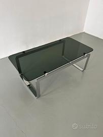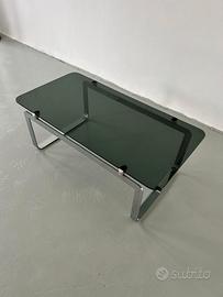 Design:Si distingue per la sua struttura in acciaio cromato con gambe a forma di slitta e un piano rettangolare in cristallo molato o vetro fumé..