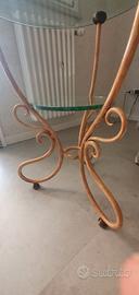 Tavolino in ferro battuto artigianale color salmone con 1 ripiano circolare in cristallo per poggia telefono e 1 ripiano più grande in cristallo molato per lampada