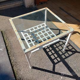 Vendo per fine utilizzo tavolino da giardino Le macchie sul bordo sono dovute al silicone tra il vetro e il ripiano che si e' ingiallito, chi e' capace puo rimuoverlo facilmente Misure 68x68 altezza 48 Euro 12 non trattabili