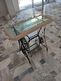 SALVE, MI CHIAMO CIRO, PROPONGO UN TAVOLINO (PIANO MARMO/VETRO E PIEDE GHISA) COMPOSTO DAL PIANO TAVOLO IN MARMO RESINA "RAV" CON INCASSO VETRO PER VEDERE IL PIEDE IN GHISA SOTTO. IL PIANO IN MARMO DA CM. 3 DI SPESSORE CON LA COSTA RIFINITA A "GOLA", MISURA CM. 84 X CM. 43. LA BASE "SINGER" IN GHISA CON RUOTE, MISURA CM. 55 X CM. 48, PER UN ALTEZZA DI CM. 71. IL DOPPIO VETRO CENTRALE, MISURA CM. 73 X CM. 32. SONO A DISPOSIZIONE PER INFORMAZIONI, Una base in ghisa "SINGER" per tavolino è un elemento d'arredo molto apprezzato per il suo fascino vintage e la robustezza. Ecco una descrizione. Descrizione: Tavolino con base in ghisa "SINGER", piano in marmo e cristallo Base: La struttura portante è realizzata con una vera base di macchina da cucire SINGER d'epoca con ruote, in ghisa nera lavorata con dettagli decorativi tipici del marchio: volute floreali, logo traforato e pedale ornamentale. La ghisa conferisce al tavolo un’ottima stabilità e un aspetto industriale raffinato. Piano in marmo: Sopra la base è montata una lastra di marmo, lucido. Il marmo fresato per incassare il vetro, dona eleganza e un tocco classico. Uso e stile Questo tavolino è perfetto come complemento d'arredo vintage/industriale, per: salotti ingressi studi professionali vetrine di showroom Coniuga storia e artigianato con materiali di pregio, ed è spesso scelto da chi ama pezzi unici dal carattere forte ma elegante. A richiesta si può avere un piano in marmo, con varie dimensioni, da preventivare. Il marmo resina RAV è un prodotto nuovo, viene formato in lastre dalle polveri del marmo con aggiunta di resina. Ha le stesse caratteristiche del marmo ma più resistente.