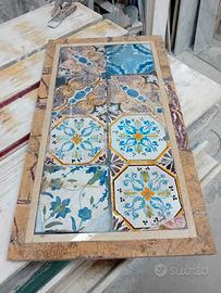 SALVE, MI CHIAMO CIRO, PROPONGO UN TAVOLINO (PIANO MARMO/RIGGIOLE NAPOLETANE E PIEDE GHISA) COMPOSTO DAL PIANO TAVOLO IN MARMO TRAVERTINO E MARMO FOREST BROWN. IL PIANO IN MARMO DA CM. 3 DI SPESSORE CON LA COSTA RIFINITA "DRITTA", MISURA CM. 93 X CM. 53. LA BASE "SINGER" IN GHISA CON RUOTE, MISURA CM. 55 X CM. 48, PER UN ALTEZZA DI CM. 71. SONO A DISPOSIZIONE PER INFORMAZIONI, Il Travertino Romano è un marmo naturale di alta qualità, conosciuto per la sua bellezza e la sua durabilità. Questo materiale viene estratto in Italia da secoli e utilizzato per molteplici scopi, dal rivestimento di edifici e monumenti, alle sculture e alle opere d’arte. E' uno dei marmi più affascinanti al mondo. Il Marmo Forest Brown è un materiale pregiato che si distingue per la sua bellezza unica e sofisticata. Il colore marrone intenso è ravvivato dalle venature bianche e grigie che creano un effetto di movimento e profondità. Questo marmo è apprezzato per la sua eleganza naturale e la sua capacità di integrarsi perfettamente in qualsiasi ambiente architettonico, dallo stile moderno a quello classico. La riggiola (dal napoletano 'a riggiola) è un tipo di mattonella in ceramica spesso maiolicata e decorata a mano, tipica della zona della costa d'Amalfi. Una base in ghisa "SINGER" per tavolino è un elemento d'arredo molto apprezzato per il suo fascino vintage e la robustezza. Ecco una descrizione. Descrizione: Tavolino con base in ghisa "SINGER", piano in marmo e cristallo Base: La struttura portante è realizzata con una vera base di macchina da cucire SINGER d'epoca con ruote, in ghisa nera lavorata con dettagli decorativi tipici del marchio: volute floreali, logo traforato e pedale ornamentale. La ghisa conferisce al tavolo un’ottima stabilità e un aspetto industriale raffinato. Piano in marmo: Sopra la base è montata una lastra di marmo CON INCASSO RIGGIOLE NAPOLETANE DELL'800, con le sue usure. Il m