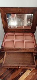 Tavolino / comodino in legno alto 1m circa, in legno, stile antico. Il piano di appoggio si presenta con dei dettagli intarsiati nel legno. Caratterizzato da una toeletta apribile con specchio e portagioie. Inoltre presenta un cassetto. Pezzo unico e molto particolare
