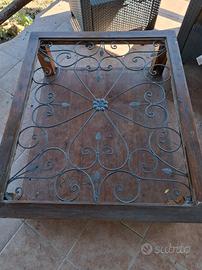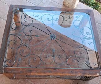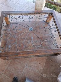 Tavolino in legno con vetro sopra e disegno in ferro battuto. Misure: 1 m x 1,20 circa.