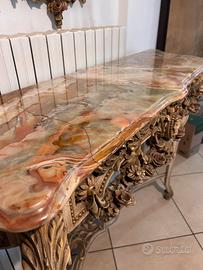 Vendo elegante consolle/tavolino in legno intagliato e dorato, con piano in onice naturale dalle belle venature. Dimensioni: 126 × 86 cm Condizioni: buono stato generale. Il piano in onice presenta due crepe visibili, stabili e solo estetiche (vedi foto). Oggetto importante e molto decorativo. 💰 Prezzo: 900 € trattabili 📍 Ritiro a mano Disponibile per visione. Contattatemi per informazioni o altre foto.