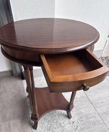Tavolino in legno con un cassetto, stile classico. Altezza: 71 cm Superficie ovale: 51x41 cm