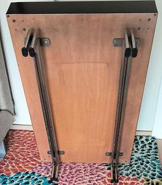 Tavolo in legno massello laccato lucido venghè. Piedi acciaio cromato, segni di usura. Dimensioni: 90x54x10 cm. Altezza: 23,5 cm