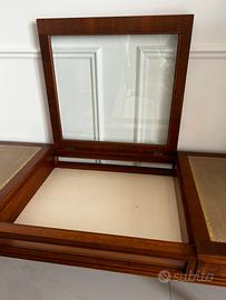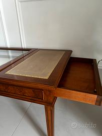Tavolino in legno pregiato con inserti in pelle trafilati in dorato e riquadro centrale in vetro molato. Presenta due cassetti sui laterali apribili con manigliette dorate