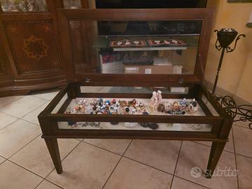 Grazioso tavolino da salotto in arte povera, in legno scuro di noce, con vetro centrale apribile, per l'inserimento di oggetti a vista.
