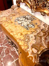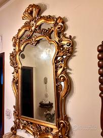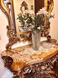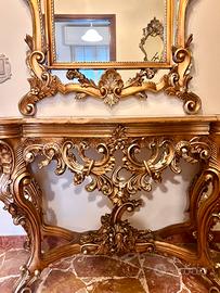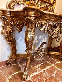 Tavolino In Marmo Con Grande Specchiera In Stile barocco. Il tavolino e’ circa degli anni ‘70 Lo stile e’ Barocco e per alcuni particolari si avvicina anche al successivo stile Rococò ’ Misure: Altezza tavolino: cm. 80 Altezza specchiera: cm. 160 Altezza totale: cm. 240 Larghezza tavolino lato parete : cm. 122 Larghezza tavolino lato davanti: cm. 102 Profondita’ tavolino: cm. 50 Larghezza specchiera: cm. 100 Tavolo sfarzoso e imponente caratteristico del XVII secolo con gambe sinuose che ricordano lo stile Rococò’ del secolo successivo (XVIII) eleganti e con decorazioni ispirate alla natura Struttura massiccia con forma geometrica rettangolare un po’ complessa, ma bilanciata Materiale in legno dorato, e pesante marmo in condizioni ottime, con venature colorate Decorato con intagli a motivi floreali Questo tavolino domina la stanza con la sua imponenza ed importanza. Lo vendo in quanto devo liberare casa e lo cedo ad un prezzo speciale al primo che verra’ a ritirarlo essendo il ritiro e smontaggio a cura dell’acquirente. Pezzo unico veramente bellissimo…da immaginare in una parete singola in un’ingresso, una sala o una camera ove la grande specchiera sara’ molto utile Per altri dettaglio prego contattatemi, resto a disposizione