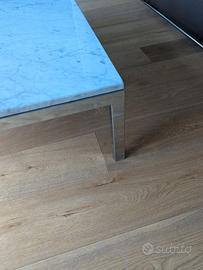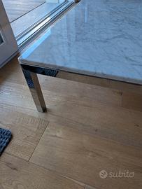 Tavolino in marmo della Tisettanta. Piano in marmo, struttura in metallo. Dimensioni 90 cm x 90 cm x 32 cm