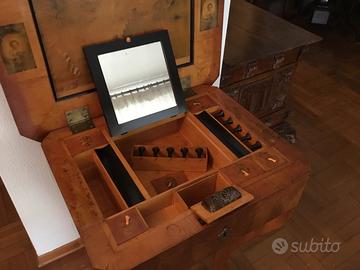 Tavolino in noce da lavoro con apertura superiore scomparti e cassettini interni. Gamba sciabolata.Epoca metà Ottocento. Prezzo trattabile.