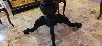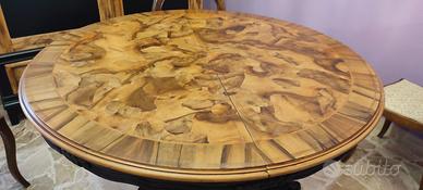 Tavolino in legno massello con ripiano in radica più 3 sedie vintage in legno. Ritiro a cura e spese di chi compra.