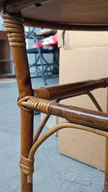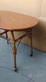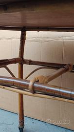 Tavolino da salotto in Legno e Rattan degli anni '50/'60, perfettamente integro, con rotelle d'epoca sulle gambe.