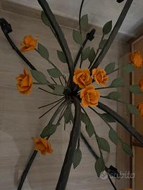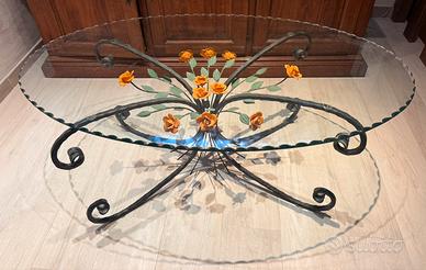 Vendo elegante tavolino da salotto con piano in vetro spesso e bordo lavorato. La base è in ferro battuto decorato a mano, con rose e foglie in metallo smaltato: un pezzo particolare, ideale per chi ama l’arredo romantico o vintage. NO SPEDIZIONE! RITIRO A MANO