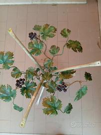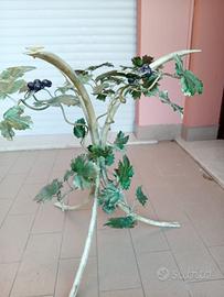 Tavolo in vetro con decorazioni in metallo policromo raffiguranti foglie di vite e uva. - base sottostante in metallo a sorreggere vetro rotondo - foglie di vite color verde e uva colorata di viola. - Misure: Largo 55 cm e alto 51 cm