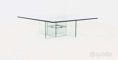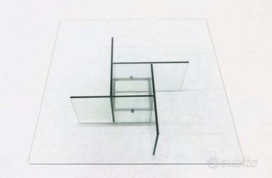 Tavolino quadrato in vetro con elemento centrale di acciaio, attribuito a Max Ingrand per Fontana Arte, anni '70, senza marchi né etichetta, in perfetto stato.