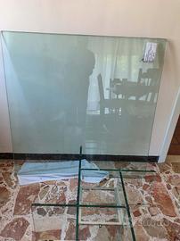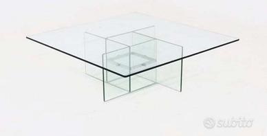 Tavolino quadrato in vetro con elemento centrale di acciaio, attribuito a Max Ingrand per Fontana Arte, anni '70, senza marchi né etichetta, in perfetto stato.