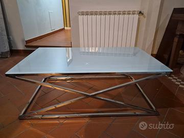 Vendo elegante tavolino basso da soggiorno con struttura in acciaio e piano in vetro.