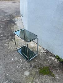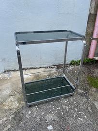 Vendo elegante carrello/tavolino portavivande su ruote, realizzato in acciaio cromato con due ripiani in vetro fumé grigio. Pezzo di arredamento vintage tipico degli anni '70, perfetto per chi ama il design italiano di quell'epoca o vuole aggiungere un tocco retrò-chic alla propria casa. La struttura in metallo cromato si presenta in buono stato generale, con la tipica patina del tempo che ne aumenta il fascino vintage. I due ripiani in vetro fumé sono integri e senza scheggiature. Il carrello è dotato di rotelle originali. Ideale come carrello bar, tavolino ausiliario in salotto, comodino di carattere o elemento decorativo. Si abbina perfettamente a interni in stile vintage, mid-century modern, industrial o glam anni '70. Ritiro a mano o spedizione su richiesta