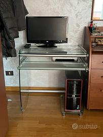 Vendo tavolo scrivania porta pc trasparente con porta tastiera estraibile scorrevole e porta tower a terra.