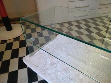 Tavolino in Vetro temperato di un centimetro di spessore, di fattura moderna, a due ripiani. Altezza 40 cm, larghezza 40 cm, lunghezza 110. bordi arrotondati, vetro curvo.