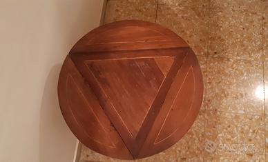 Tavolino inglese anni 60 rotondo in legno, di design artigianale, caratterizzato da un motivo geometrico a triangoli intarsiati.