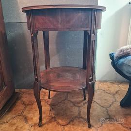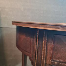 Tavolino in stile inglese, presenta intarsi con diverse essenze, queste creano geometrie lineari, presenta inserti in ottone come i piedini e la maniglia, anche il profilo del piano è in ottone, preferibile ritiro di persona.