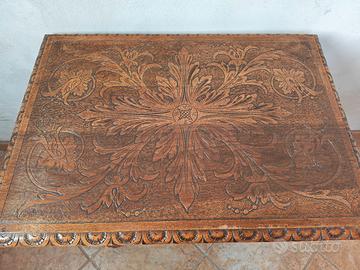 tavolino in stile neorinascimentale o eclettico, caratterizzato da un piano riccamente intagliato con motivi floreali e a volute. Le gambe sono lavorate al tornio e unite da una crociera, con un ripiano intermedio protetto da una piccola ringhiera a colonnine.