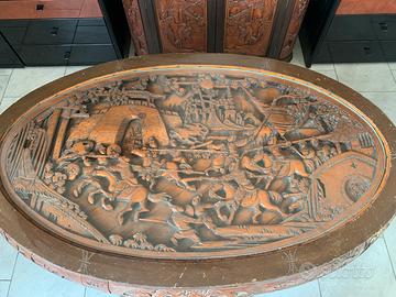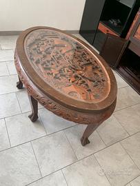 Tavolino ovale da thè cinese vintage anni 50/60 in legno massello, il piano protetto da un vetro è stato minuziosamente intagliato a mano a rilievo raffiguranti varie figure in piedi circondati da una scena paesaggistica.