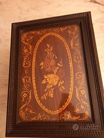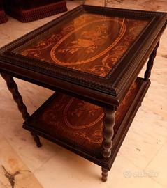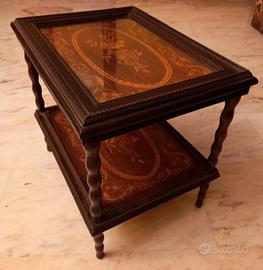 Tavolino intarsiato, della 2° metà "800, stile Napoleone III. Modello a due ripiani ( etagere) con gambe tornite. Entrambi i piani presentano raffinati intarsi floreali, in vari legni policromi ( Marquetry). Rifiniture dei bordi inegno scuro ebanizzato, decorati. Eccellente stato di conservazione. Misure: cm 64 x cm 48 , altezza cm 58. Si trova a Milano città. RITIRO E TRASPORTO A CARICO DELL'ACQUIRENTE.