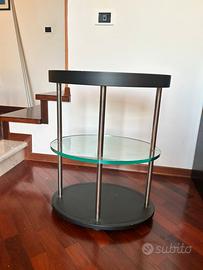 Tavolino ovale di Zanotta, nero con vetro e cuoio. Altezza 60cm, larghezza 50cm, profondità 35cm<