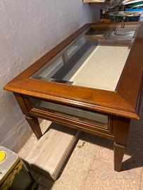 Tavolino da salotto in legno e vetro con sportelli laterali apribili…unico difetto vetro superiore scheggiato in un angolo visibile nell’ultima foto