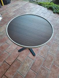 Tavolino con piede in metallo, ripiano in truciolato e bordo in pelle. Altezza 63 cm e diametro 70 cm.