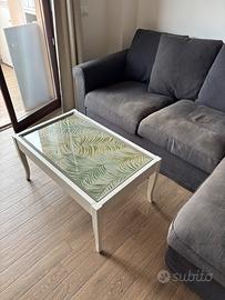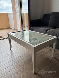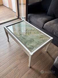 Tavolino da salotto per divano fatto a mano, di legno biaco con piano in vetro e sotto piano con effetto foglie e palme. Misure 91x56 h45cm