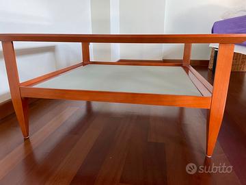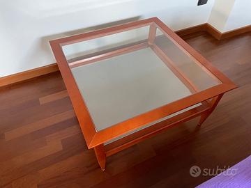 endo tavolino quadrato in legno di ciliegio con ripiani in cristallo.