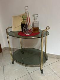Vendo 2 tavolini da soggiorno, uno in legno massello e vetro e uno porta bottiglie in vetro e ottone. Condizioni ottime.