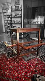 Tavolino da servizio liberty impiallacciato mogano, Italia fine XIX - inizio XX secolo. Su ciascuno dei lati presenta un'anta in vetro molato la quale, una volta aperta, costituisce ulteriore piano d'appoggio.